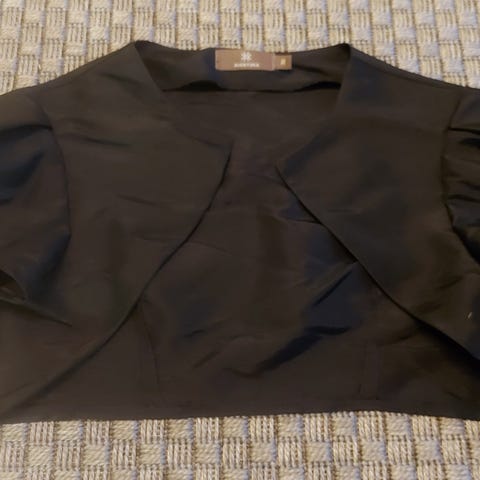 Musta neulebolero, koko M, lappu (jossa tuotteen tiedot) on leikattu pois. Hyvin joustava materiaali on varmaankin jotain polyesteriä/-amidia. Ns. kauluksen saa muotoiltua moneen asentoon. Pari kertaa käytetty... siis siisti.
