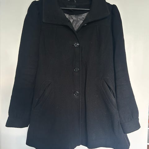Musta villakangastakki kauniilla rypytysyksityiskohdalla. Koko 38, vastaa kokoaan. Kunto hyvä, vetoketju irronnut alaosasta pienen matkaa vuoresta, ei haittaa käyttöä .