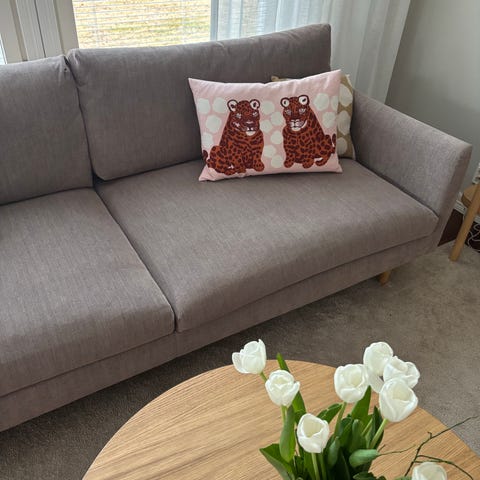 Sohvassa on ihanan pehmeät höyhentyynyt, jotka vaativat möyhimistä säilyttääkseen ryhtinsä.