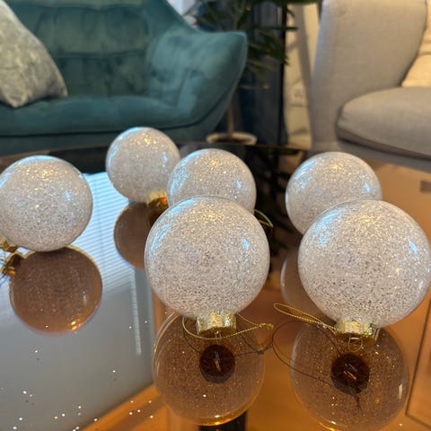 Valkoiset joulupallot 4kpl yhteensä 2e. Glitterillä päällystetty 2kpl, hopeisilla tähdillä 2kpl. Läpimitta 6cm. Nouto tai Toridiili.