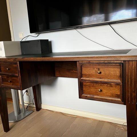 Työpöydän runko ja jalat on valmistettu saarnipuusta. Pöytälevy ja vetolaatikot saarniviilutettua MDF-levyä. Yksityiskohdat terästä. Jaloissa lattiaa suojaavat muovitassut.