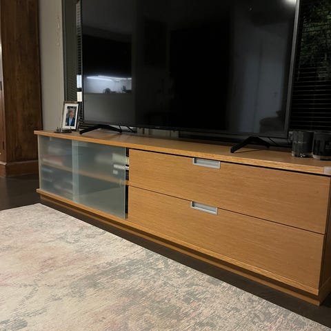 Tv-taso on valmistettu saarniviilutetusta MDF:stä. Jalat massiivisaarnea. Jalkojen korkeus 15 cm. Puhdistus mietoon pesuaineeseen kostutetulla liinalla ja kuivaus välittömästi.