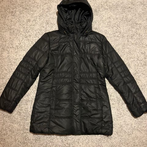 Luhdan talvitakki hupulla, vetoketju ja nepparit, kerran pidetty. Viininpunainen, tumma. Takana helmassa vetoketju.