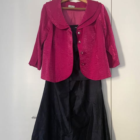 Naisten juhlava puna-musta jakku kauniilla kauluksella.Edessä 4nappia.Jakun pituus 63cm.Hihojen pituus kainalosta mitattuna 30cm.Hihat voi halutessaan kääntää.Mitta kai-kai 58cm.Edessä ja takana kauniit laskokset.Merkki Modelia.Koko 44. 100%polyester.30*vesipesu.