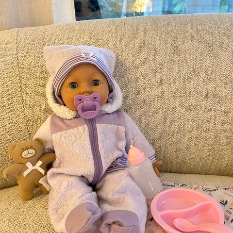 Valkopukuisesta tyttö nukesta saa tarjota. Puku ei myynnissä.