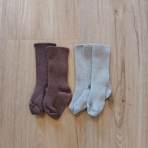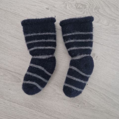 Kahdet käytetyt merinovillasukat vauvalle. Vihreäraidalliset merinovillafroteeta.