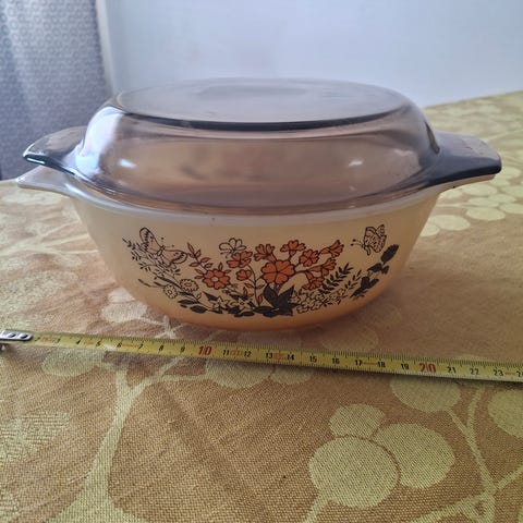 Vanha kulunut PYREX vuoka ja lasikansi 3 EUROLLA . Vetoisuus 3 litraa. Kansi ei ole alunperin kuulunut vuokaan. VAIN NOUTO kotoa Keljonkankaantieltä käteisellä. EI LÄHETYSTÄ. Kieli ; vain Suomi.