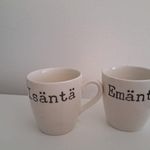 Valkoiset mukit joissa kullatut tekstit ja reunat.