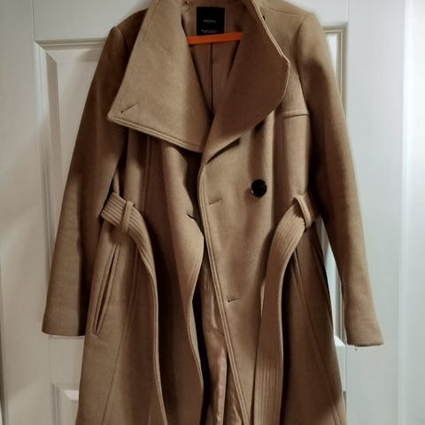 Mangon käsintehty villakangastakki, pitkä oversized malli. Kaksi taskua ja säädettävä, irroitettava vyö.