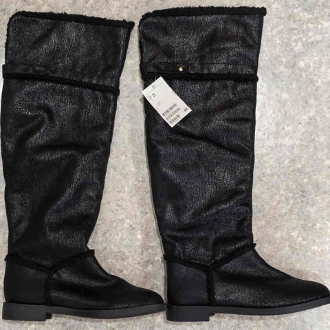 Vähäisessä käytössä oleet, lämpimät ja tilavalestiset saappaat. Ei vedenpitävät. Varren sisäpuolella 5cm:n mitalta tekokarvaa. Irtopohjallisen mitta 27cm, varrren korkeus takaa 25cm. Vetoketjukiinnitys sivuissa ja nauhakiinnitys edessä. Vasemman kengän sisäsivun tikkaus itse korjattu sentin matkalta (näkyy viimeisessä kuvassa).