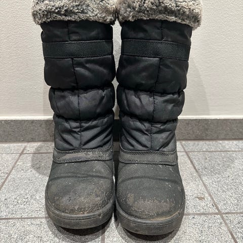 Jo reilummin käytössä olleet Reimatecin talvikengät. Käytön jälkiä näkyy pinnassa kulumisena. Kengät on kuitenkin edelleen ehjät lukuunottamatta oikean kengän sisäsivun pintakankaassa olevaa reikää. Reikä ei siis ole läpi vaan ainoastaan pinnassa.