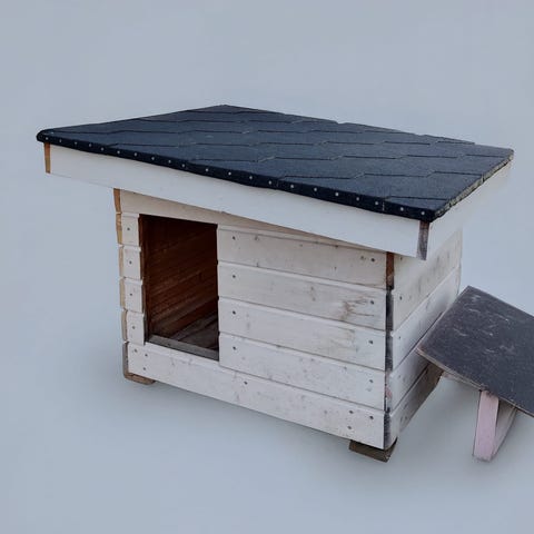 Eristetty, eteisellä varustettu koirankoppi, ikkunaan on pleksi mutta nyt irti