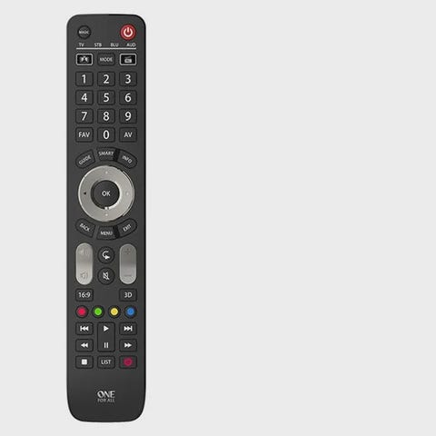 One For All Evolve 4 URC 7145 -kaukosäädin mahdollistaa jopa neljän laitteen ohjauksen – televisio, digiboksi, Blu-ray/DVD -soitin ja äänijärjestelmä.