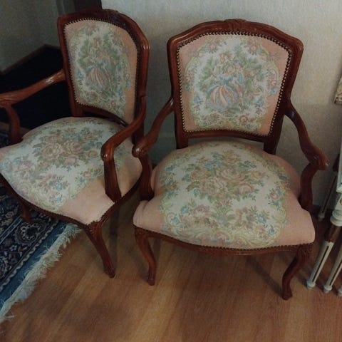 Myydään kauniisti patinoituneet puiset maalaisromanttiset tuolit (4 kpl). Kuvassa vain kolme, koska yksi on kellarissa. Ostettu aikoinaan käytettynä. Myyjän mukaan tuolit on valmistettu Ranskassa. Verhoilu nahkaa tai keinonahkaa.