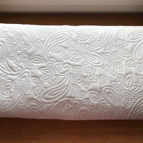 Päiväpeitto 120 cm leveään sänkyyn. Päällinen 60% polyester, 40% nylön satin, filling 100 % polyester, backing 50% nylon, 50% cotton. Laskeutuu sängyn reunasta n. 50cm. Kaksi tyynynpäällistä n. 70 x 45, samoin kirjailtu kuin itse peitto.