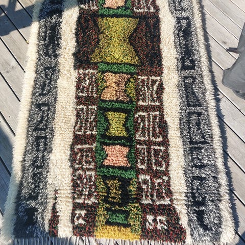 Myydään kuvan ryijy nimeltään Vanha kellokaappi. Mallin suunnittelija Toini Kallio.