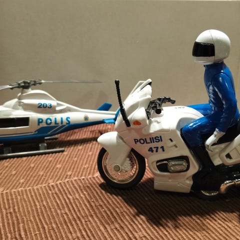 Metallinen poliisiauto, vilkut katolta irronneet. Motormania merkkinen poliisihelikopteri. Hinta 1 €/kpl.