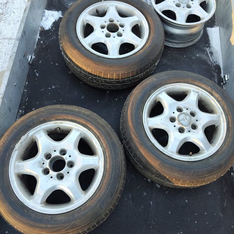 w168 a mersun alta kesärenkaat alkuperäisillä aluvanteilla. pientä hapettumaa ja jälkeä on. renkaissa viellä jokunen milli pintaa, paistoleima vuodelta 2018