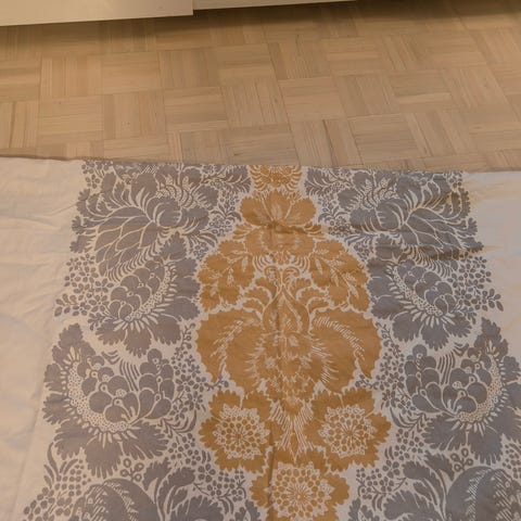 Marimekon puketti pöytäliinaksi tai verhoksi. Kuin uusi, kaksi pientä tahraa löysin, lähtee varmasti pesussa. Kuvista näkee tarkemmin. Tarjoa!