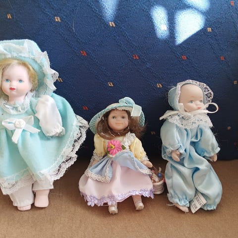 Kaksi vanhaa nukkea yhteishintaan. Noin 20cm,. Kasvot, kädet ja jalat keramiikkaa, vartalo pehmyt. Hyväkuntoiset!