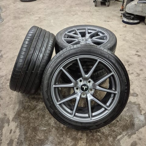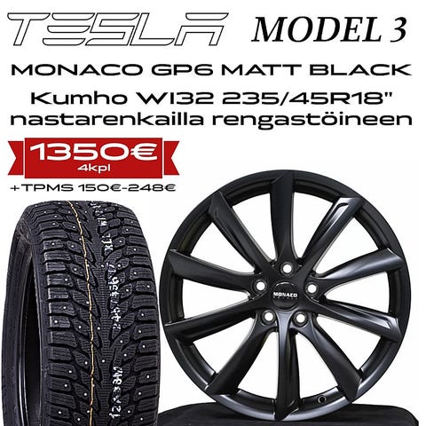 Tummanharmaat Monaco GP6 vanteet 8×18 5×114,3 jaolla, ET 38, kr 64,1. Landsail Qirin 990 EV kesärenkailla 235/45-18 98W XL, DOT 3822. Sisältää tavalliset TPMS-rengaspainetunnistimet! Soveltuu mm. Tesla 3.