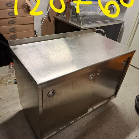 Erittäin siisti Metoksen teräspöytä. L 220 cm, S 65 cm K 89 cm ( säätöjalat. Marginaaliverollinen.