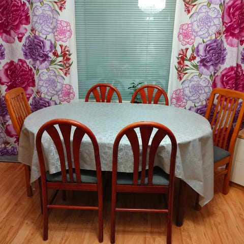 Täyspuinen pöytä ja pehmustetut tuolit