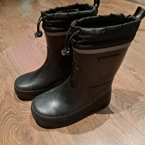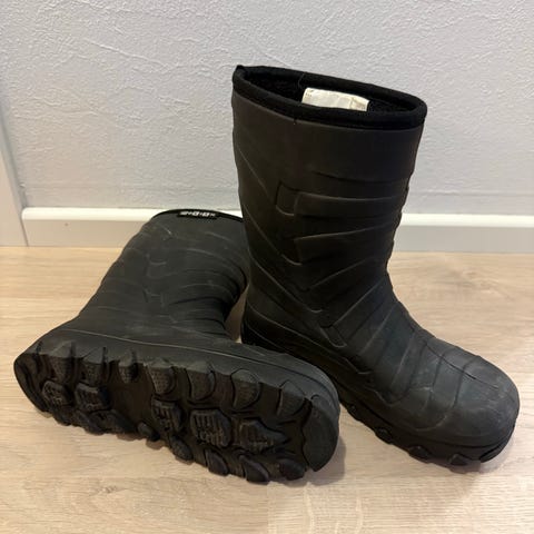 Käytetyt, mutta ehjät kumisaappaat. Sisävuori ehjä kauttaaltaan ja melko pörröinenkin vielä. Ulkopinta enemmän kulunut tai elämää nähnyt.