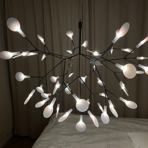 Valaisin Grönlundin pisaranmuotoinen Meukow-riippuvalaisin sopii niin ruokapöydän kuin sohvaryhmän ylle. Valaisimen väreilevä lasipinta heijastaa valoa kauniisti luoden miellyttävän tunnelman huoneeseen.