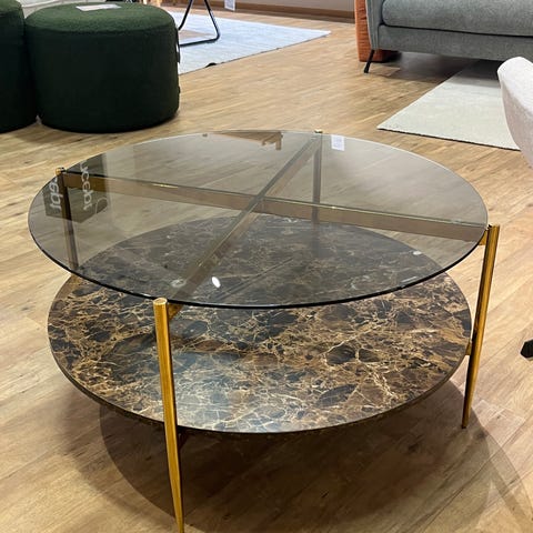 Sohvapöydän jalat ovat metallia ja tasot saarnia.