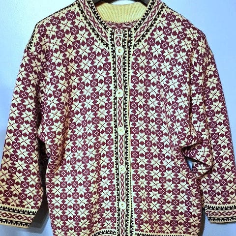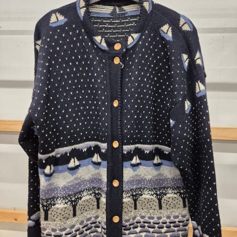 Upea valko-tummansinikuvioinen kirjoneulevillatakki. Täyttä villaa. Villatakissa kokonumero L, vastaa lähinnä kokoa 42-44. Pituus 74 cm, ympärimitta 110 cm ja hihan pituus (hartialinja laskettu) 53 cm.