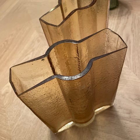 Maija Carlssonin suunnittelema lasinen maljakko. Valmistaja Oy Kumela, 1950–1959