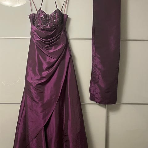Säihkyvä, kokopitkä, pieni laahus. Upea uusi iltapuku, laput vielä kiinni. Koko 38-40. Mitat: kai-kai 45 cm, olka-helma 137 cm. Mekossa koko L, mutta vastaa mielestäni enemmän kokoa M.
