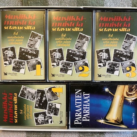 Kuvanmukaisia, hyvässä iskussa olevia kasetteja sisältäen sota-ajan lauluja.