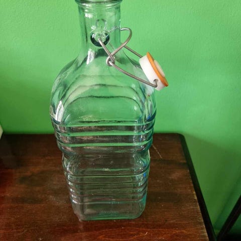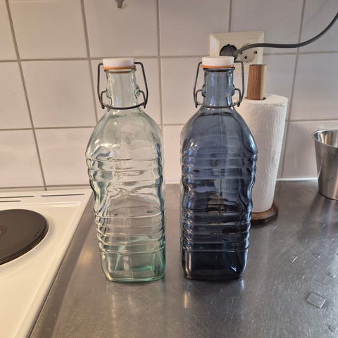 Hyvin vähällä käytöllä ollut Jamie Oliver -lasipullo, väri vihertävän kirkas.