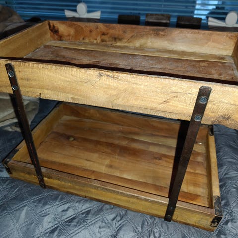 Myydään puinen tarjotin, jossa on keinonahkainen pohja.