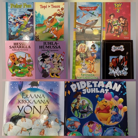 4 kpl Disneyn lasten kirjoja, hyvässä kunnossa, kuin uusia. Yhdessä kirjassa 2 kirjaa yhdessä: Kapteeni koukku ja Peter Pan, Kaapattu kaukoputki, Tepa panee tuulemaan, Kolme muskettisoturia