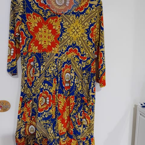 Kuvanmukainen mekko ohutta trikookangasta. Kai-kai 52-54, pituus n. 110. Mahdolliset postikulut 8e.
