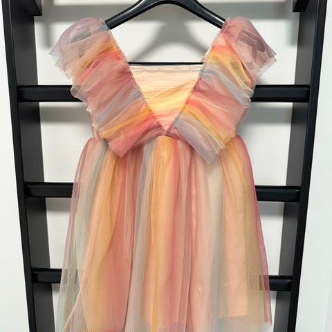H&M:n tyllimekko koossa 122/128. Yläosa jo hieman nukkainen ja väri haalistunut tummista raidoista.