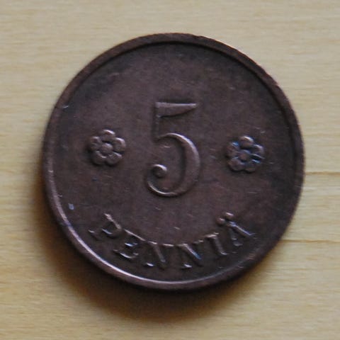5 pennin kolikko vuodelta 1936, kuparia, paino 2,5 g, läpimitta 18 mm. Hinta 1 euro. Katso kunto kuvasta. Kiva lahjaidea esim. syntymäpäivänä. Nouto Helsingistä myyjän osoitteesta tai postitus kirjeenä 2,90.