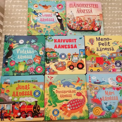 Kaksi ääninappikirjaa. Hiukan lukemisen jälkiä joissain kulmissa. Huom. kumpikaan ei sisällä pattereita, mutta toimivina laitettu sivuun.