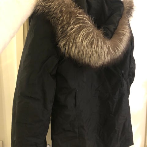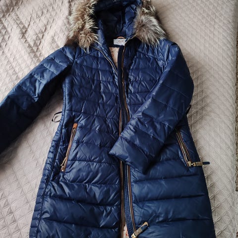 Hyvässä kunnossa untuvatakki,väri tummempi kuin kuvassa.Kaulas aito turkis ,saa irrottaa.Pituus noin 70 cm .2 rivi napit .Mali,alas päin leveämpi .