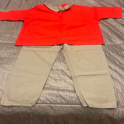 Harmaa collegeasu, paita ja housut.