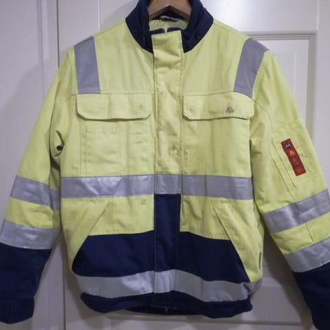 Käyttämättä jääneet topatut työtakki ja housut. Laput paikoillaan, vanuvuori, paljon taskuja ja kangas likaa hylkivä.