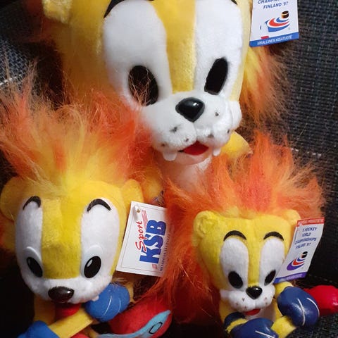 Vuoden 1997 kotikisojen kisamaskotti Suomileijona pehmolelu. Ehjä ja siisti, mutta tuotelappu kulunut lähes lukemattomaksi. Hahmon koko noin 16cm.