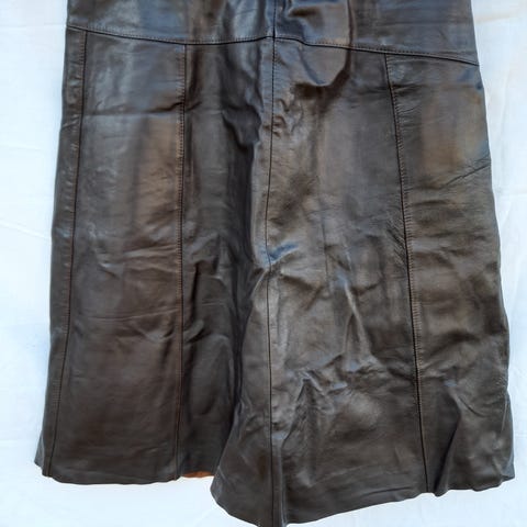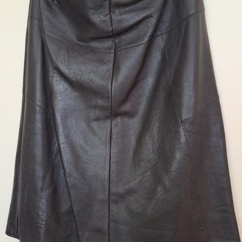 Myyn aiemmin myymieni nahkavaatteiden lisäksi aika vähän käytetyn, 44 kooksi merkityn, vuorillisen, mustan, laadukasnahkaisen puolihameen keinonahkaisen hinnalla. (Harmittaa, kun moni myy harhauttaen Torissa otsikolla nahkahame, nahkahousut keinoaineisia vaatteita.) Säilytyksessä tulleet painumat kyllä oikenevat käytössä. Mittoja sopivuuden arvioimiseksi ovat: pituus n.60cm, kaksinkertainen nahkavyötärö n.82cm; levenevä helma n.1m60cm. Isot nahkapalat ovat hameen keskivaiheilla säännöllisesti viistoon yläosastaan leikatut. Nahka on aika ajoin suosittu materiaali ja suosittelen vaatetta monenmoiseen menoon eri yläosien yhdistelmissä ja erilaisten kenkäparien valinnoissa. Tällä on vielä vuosikymmeniä käyttöikää tai sitten uusiokäyttöä. Tutkaile monenmoisia Tori-ilmoituksiani (mm. vintagea, keräilytavaraa, figuureja, nukkeja, merkkejä, astioita, jalkineita, vaatteita, metallitavaraa) ja ryhdy tilaamaan jotakin mieleistä. Samassa lähetyksessä useampi tuote kohtuullistaa postikulujasi.