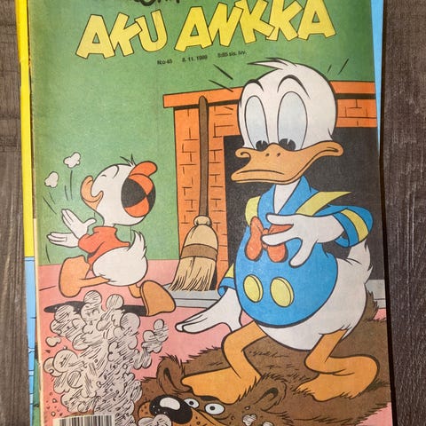 Kaksi Aku Ankka sarjakuva lehteä (otsakkeen nimiset), Ilta-Sanomien Aku juhlalehti + 4 julistetta.
