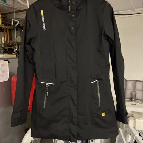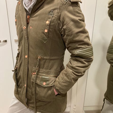 Viinipunainen parkatakki koossa L. Sopii syksyyn ja kevääseen. Helma ylettää takapuolen alapuolelle. Taskut, kiristysnauha vyötäröllä, hupussa nepparikiinnitteinen karva. Polyesteria.