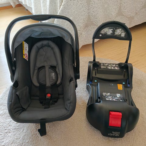 Britax Römer turvakaukalo, vauvapienennin mukana. Voi kiinnittää turvavöillä. Kevyt kantaa.