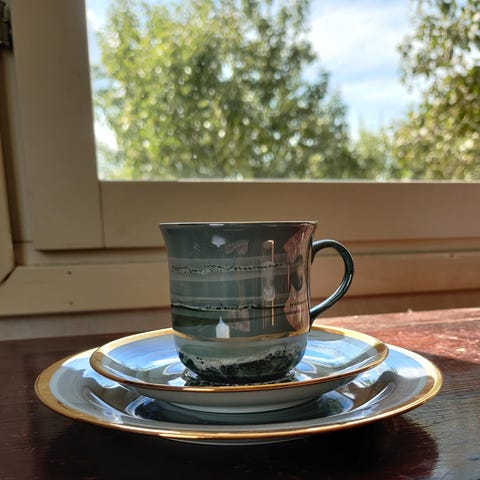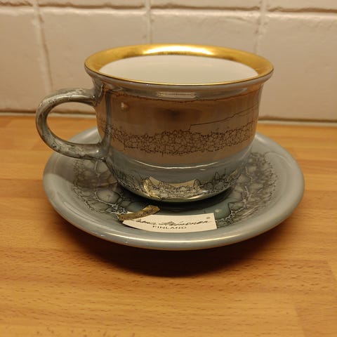 Myydään uudet Leena Heinonen pinkit kahvikupit lautasella. Kultaus 24 kar